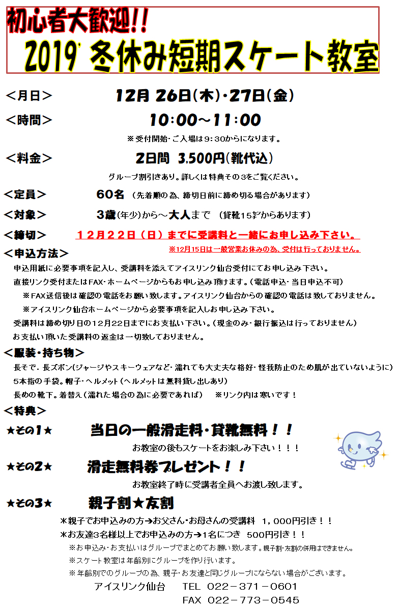 >2019冬休み短期スケート教室 ※定員に達しましたので締切とさせて頂きます。
